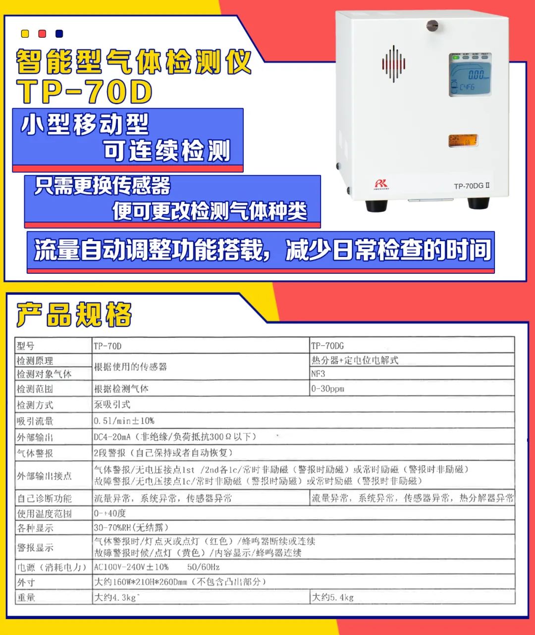 ● TP-70D是一款智能型可移动式气体检测仪,适用于危险气体的泄漏检测以及工厂内的环境监测。